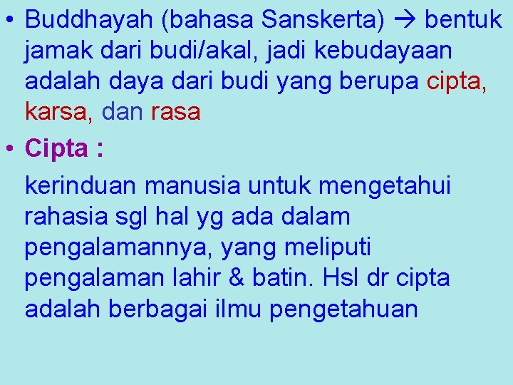 • Buddhayah (bahasa Sanskerta) bentuk jamak dari budi/akal, jadi kebudayaan adalah daya dari budi yang berupa cipta, karsa, dan rasa • Cipta : kerinduan manusia untuk mengetahui rahasia sgl hal yg ada dalam pengalamannya, yang meliputi pengalaman lahir & batin. Hsl dr cipta adalah berbagai ilmu pengetahuan