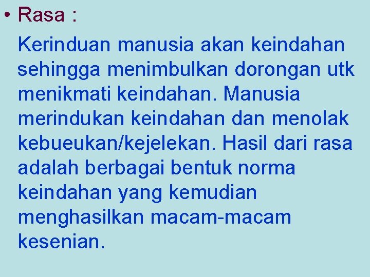 • Rasa : Kerinduan manusia akan keindahan sehingga menimbulkan dorongan utk menikmati keindahan. Manusia merindukan keindahan dan menolak kebueukan/kejelekan. Hasil dari rasa adalah berbagai bentuk norma keindahan yang kemudian menghasilkan macam-macam kesenian.