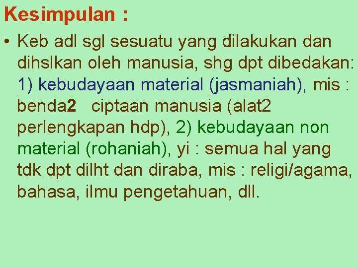 Kesimpulan : • Keb adl sgl sesuatu yang dilakukan dihslkan oleh manusia, shg dpt dibedakan: 1) kebudayaan material (jasmaniah), mis : benda 2 ciptaan manusia (alat 2 perlengkapan hdp), 2) kebudayaan non material (rohaniah), yi : semua hal yang tdk dpt dilht dan diraba, mis : religi/agama, bahasa, ilmu pengetahuan, dll.