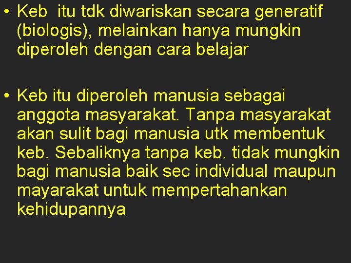 • Keb itu tdk diwariskan secara generatif (biologis), melainkan hanya mungkin diperoleh dengan cara belajar • Keb itu diperoleh manusia sebagai anggota masyarakat. Tanpa masyarakat akan sulit bagi manusia utk membentuk keb. Sebaliknya tanpa keb. tidak mungkin bagi manusia baik sec individual maupun mayarakat untuk mempertahankan kehidupannya