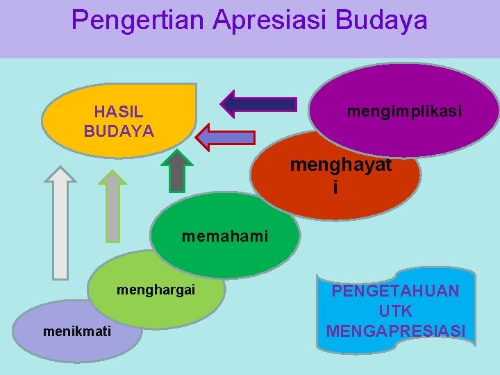 Pengertian Apresiasi Budaya HASIL BUDAYA mengimplikasi menghayat i memahami menghargai menikmati PENGETAHUAN UTK MENGAPRESIASI