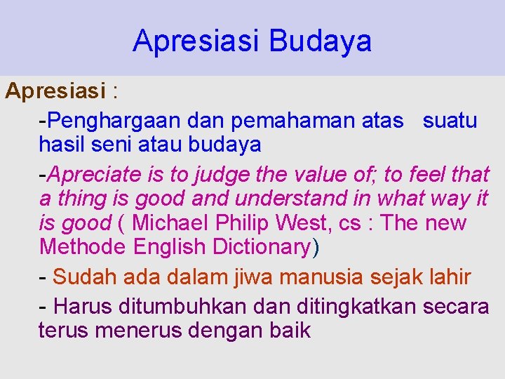 Apresiasi Budaya Apresiasi : -Penghargaan dan pemahaman atas suatu hasil seni atau budaya -Apreciate is to judge the value of; to feel that a thing is good and understand in what way it is good ( Michael Philip West, cs : The new Methode English Dictionary) - Sudah ada dalam jiwa manusia sejak lahir - Harus ditumbuhkan ditingkatkan secara terus menerus dengan baik