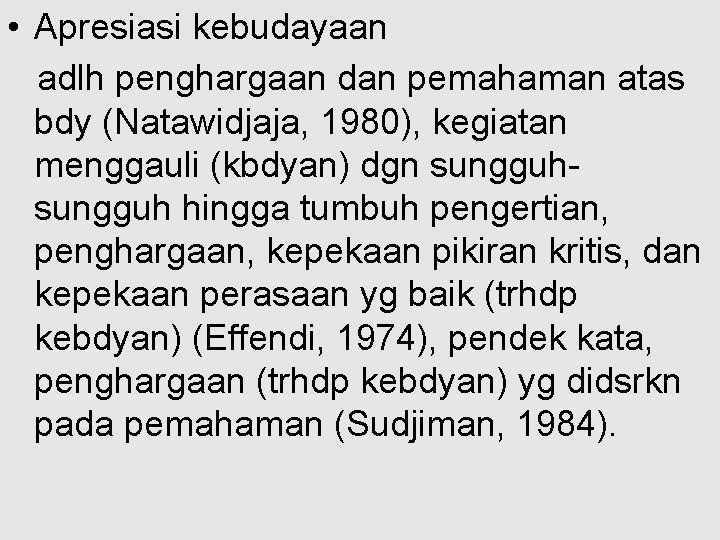 • Apresiasi kebudayaan adlh penghargaan dan pemahaman atas bdy (Natawidjaja, 1980), kegiatan menggauli (kbdyan) dgn sungguh hingga tumbuh pengertian, penghargaan, kepekaan pikiran kritis, dan kepekaan perasaan yg baik (trhdp kebdyan) (Effendi, 1974), pendek kata, penghargaan (trhdp kebdyan) yg didsrkn pada pemahaman (Sudjiman, 1984).