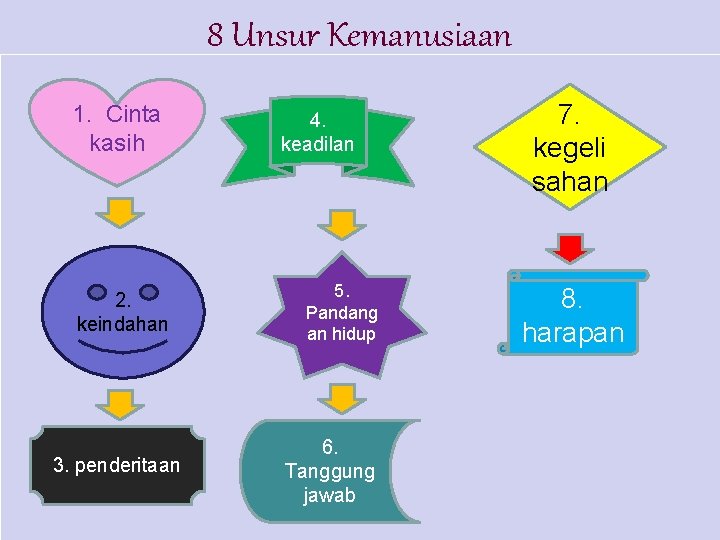 8 Unsur Kemanusiaan 1. Cinta kasih 2. keindahan 3. penderitaan 4. keadilan 5. Pandang an hidup 6. Tanggung jawab 7. kegeli sahan 8. harapan