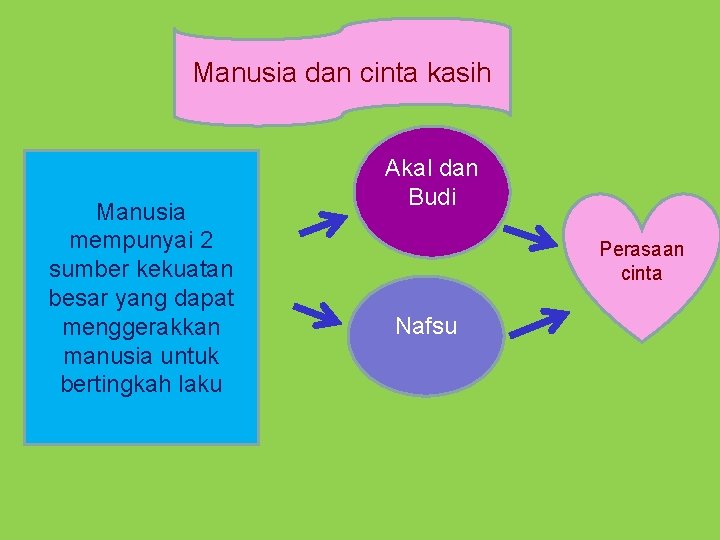 Manusia dan cinta kasih Manusia mempunyai 2 sumber kekuatan besar yang dapat menggerakkan manusia untuk bertingkah laku Akal dan Budi Perasaan cinta Nafsu