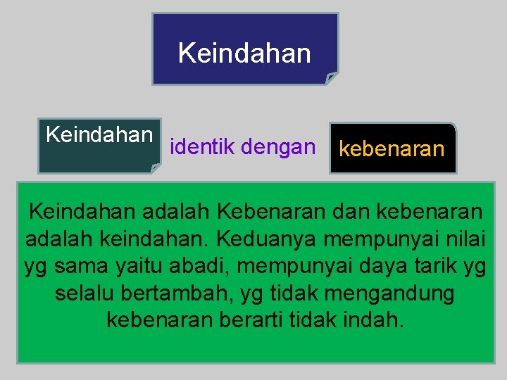 Keindahan identik dengan kebenaran Keindahan adalah Kebenaran dan kebenaran adalah keindahan. Keduanya mempunyai nilai yg sama yaitu abadi, mempunyai daya tarik yg selalu bertambah, yg tidak mengandung kebenaran berarti tidak indah.