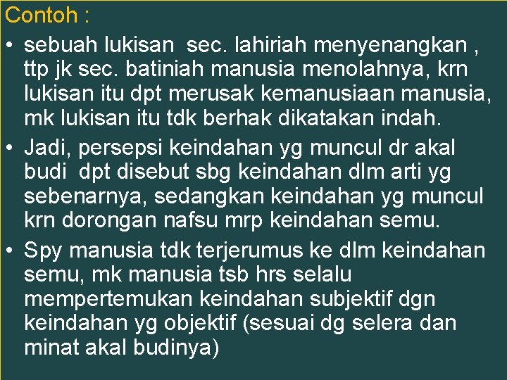Contoh : • sebuah lukisan sec. lahiriah menyenangkan , ttp jk sec. batiniah manusia menolahnya, krn lukisan itu dpt merusak kemanusiaan manusia, mk lukisan itu tdk berhak dikatakan indah. • Jadi, persepsi keindahan yg muncul dr akal budi dpt disebut sbg keindahan dlm arti yg sebenarnya, sedangkan keindahan yg muncul krn dorongan nafsu mrp keindahan semu. • Spy manusia tdk terjerumus ke dlm keindahan semu, mk manusia tsb hrs selalu mempertemukan keindahan subjektif dgn keindahan yg objektif (sesuai dg selera dan minat akal budinya)