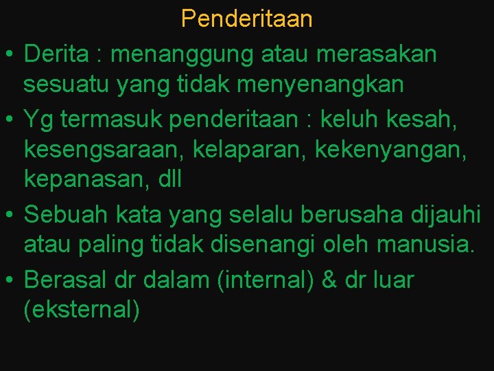 • • Penderitaan Derita : menanggung atau merasakan sesuatu yang tidak menyenangkan Yg termasuk penderitaan : keluh kesah, kesengsaraan, kelaparan, kekenyangan, kepanasan, dll Sebuah kata yang selalu berusaha dijauhi atau paling tidak disenangi oleh manusia. Berasal dr dalam (internal) & dr luar (eksternal)