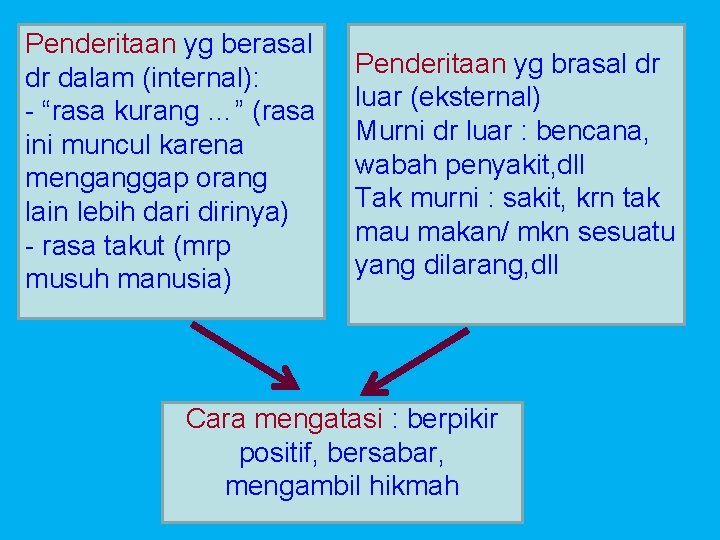 Penderitaan yg berasal dr dalam (internal): - “rasa kurang …” (rasa ini muncul karena menganggap orang lain lebih dari dirinya) - rasa takut (mrp musuh manusia) Penderitaan yg brasal dr luar (eksternal) Murni dr luar : bencana, wabah penyakit, dll Tak murni : sakit, krn tak mau makan/ mkn sesuatu yang dilarang, dll Cara mengatasi : berpikir positif, bersabar, mengambil hikmah