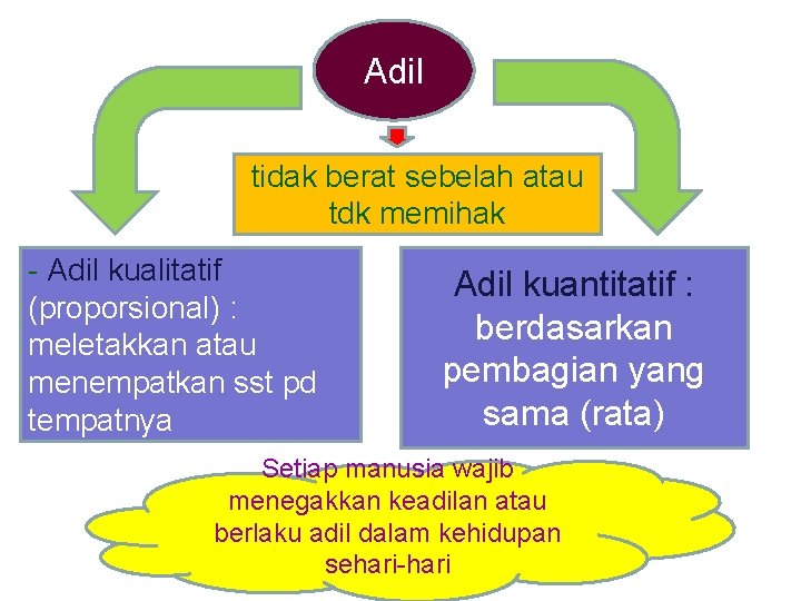 Adil tidak berat sebelah atau tdk memihak - Adil kualitatif (proporsional) : meletakkan atau menempatkan sst pd tempatnya Adil kuantitatif : berdasarkan pembagian yang sama (rata) Setiap manusia wajib menegakkan keadilan atau berlaku adil dalam kehidupan sehari-hari