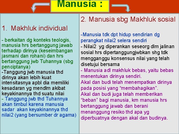 Manusia : 2. Manusia sbg Makhluk sosial 1. Makhluk individual -Manusia tdk dpt hidup sendirian dg - berkaitan dg konteks teologis, perangkat nilai 2 selera sendiri manusia hrs bertanggung jawab - Nilai 2 yg diperankan seseorg dlm jalinan terhadap dirinya (keseimbangan sosial hrs dipertanggungjwbkan shg tdk jasmani dan rohani) dan hrs mengganggu konsensus nilai yang telah bertanggung jwb Tuhannya (sbg disetujui bersama. penciptanya) - Manusia adl makhluk bebas, yaitu bebas -Tanggung jwb manusia thd menentukan dirinya sendiri. dirinya akan lebih kuat Akal dan budi telah menempatkan dirinya intensitasnya apbl dia memiliki kesadaran yg mendlm akibat pada posisi yang “membahagikan”. keyakinannya thd suatu nilai Akal dan budi juga telah memberikan - Tanggung jwb thd Tuhannya “beban” bagi manusia, krn manusia hrs akan timbul karena manusia bertanggung jawab dan berani sadar akan keyakinannya thd menanggung resiko thd apa yg nilai 2 (yang bersumber dr agama) diperbuatnya dengan akal dan budinya.