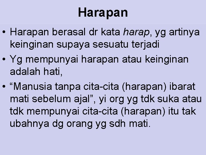 Harapan • Harapan berasal dr kata harap, yg artinya keinginan supaya sesuatu terjadi • Yg mempunyai harapan atau keinginan adalah hati, • “Manusia tanpa cita-cita (harapan) ibarat mati sebelum ajal”, yi org yg tdk suka atau tdk mempunyai cita-cita (harapan) itu tak ubahnya dg orang yg sdh mati.