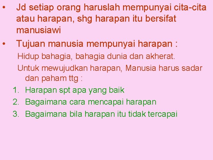 • • Jd setiap orang haruslah mempunyai cita-cita atau harapan, shg harapan itu bersifat manusiawi Tujuan manusia mempunyai harapan : Hidup bahagia, bahagia dunia dan akherat. Untuk mewujudkan harapan, Manusia harus sadar dan paham ttg : 1. Harapan spt apa yang baik 2. Bagaimana cara mencapai harapan 3. Bagaimana bila harapan itu tidak tercapai