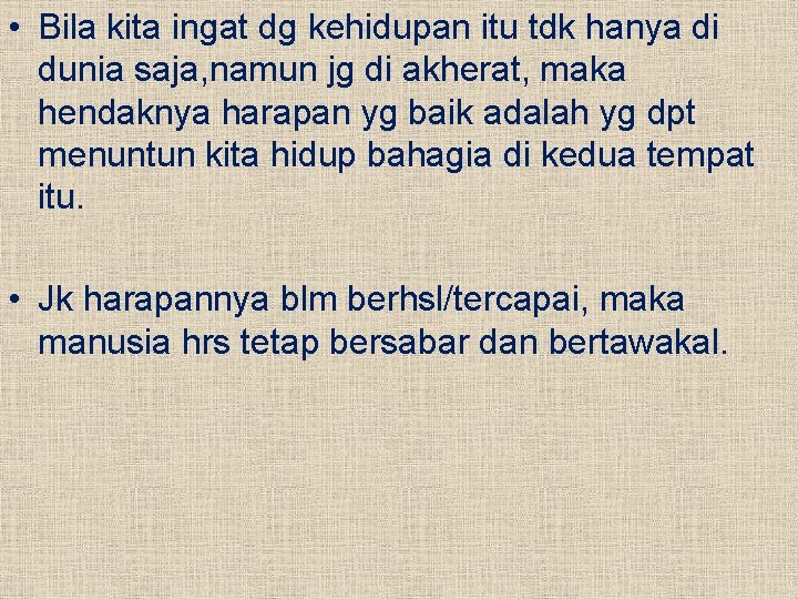• Bila kita ingat dg kehidupan itu tdk hanya di dunia saja, namun jg di akherat, maka hendaknya harapan yg baik adalah yg dpt menuntun kita hidup bahagia di kedua tempat itu. • Jk harapannya blm berhsl/tercapai, maka manusia hrs tetap bersabar dan bertawakal.