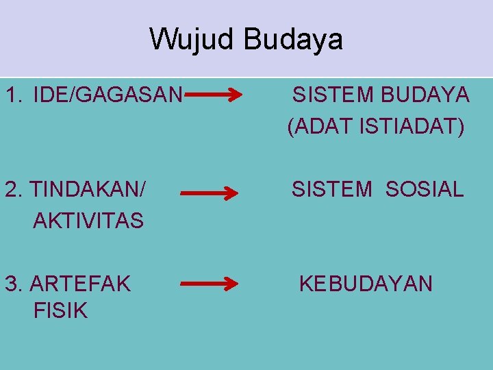 Wujud Budaya 1. IDE/GAGASAN SISTEM BUDAYA (ADAT ISTIADAT) 2. TINDAKAN/ SISTEM SOSIAL AKTIVITAS 3. ARTEFAK KEBUDAYAN FISIK