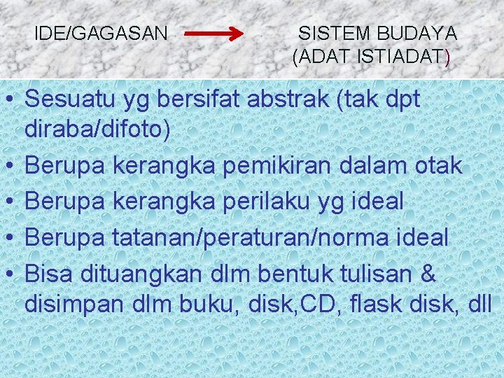 IDE/GAGASAN SISTEM BUDAYA (ADAT ISTIADAT) • Sesuatu yg bersifat abstrak (tak dpt diraba/difoto) • Berupa kerangka pemikiran dalam otak • Berupa kerangka perilaku yg ideal • Berupa tatanan/peraturan/norma ideal • Bisa dituangkan dlm bentuk tulisan & disimpan dlm buku, disk, CD, flask disk, dll