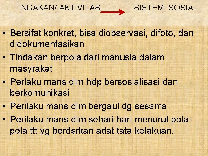TINDAKAN/ AKTIVITAS SISTEM SOSIAL • Bersifat konkret, bisa diobservasi, difoto, dan didokumentasikan • Tindakan berpola dari manusia dalam masyrakat • Perlaku mans dlm hdp bersosialisasi dan berkomunikasi • Perilaku mans dlm bergaul dg sesama • Perilaku mans dlm sehari-hari menurut pola ttt yg berdsrkan adat tata kelakuan.