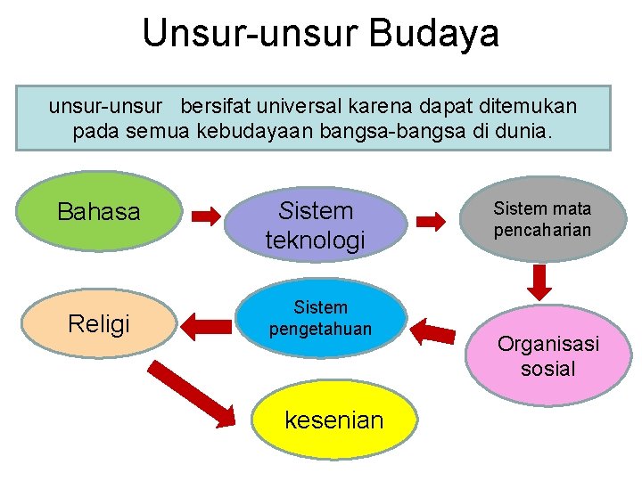 Unsur-unsur Budaya unsur-unsur bersifat universal karena dapat ditemukan pada semua kebudayaan bangsa-bangsa di dunia. Bahasa Religi Sistem teknologi Sistem pengetahuan kesenian Sistem mata pencaharian Organisasi sosial