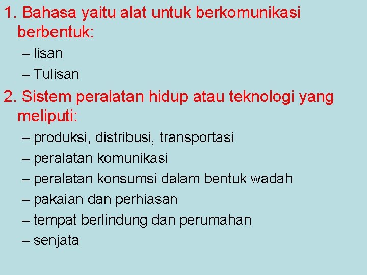 1. Bahasa yaitu alat untuk berkomunikasi berbentuk: – lisan – Tulisan 2. Sistem peralatan hidup atau teknologi yang meliputi: – produksi, distribusi, transportasi – peralatan komunikasi – peralatan konsumsi dalam bentuk wadah – pakaian dan perhiasan – tempat berlindung dan perumahan – senjata