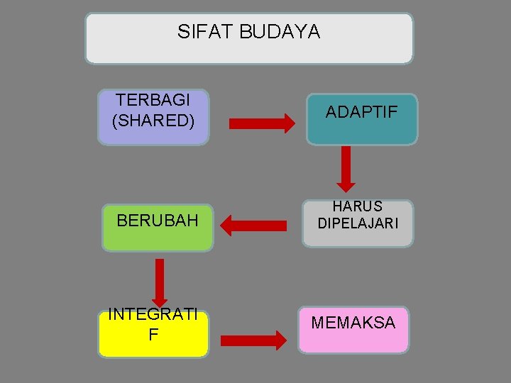 SIFAT BUDAYA TERBAGI (SHARED) ADAPTIF BERUBAH HARUS DIPELAJARI INTEGRATI F MEMAKSA