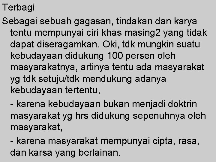 Terbagi Sebagai sebuah gagasan, tindakan dan karya tentu mempunyai ciri khas masing 2 yang tidak dapat diseragamkan. Oki, tdk mungkin suatu kebudayaan didukung 100 persen oleh masyarakatnya, artinya tentu ada masyarakat yg tdk setuju/tdk mendukung adanya kebudayaan tertentu, - karena kebudayaan bukan menjadi doktrin masyarakat yg hrs didukung sepenuhnya oleh masyarakat, - karena masyarakat mempunyai cipta, rasa, dan karsa yang berlainan.