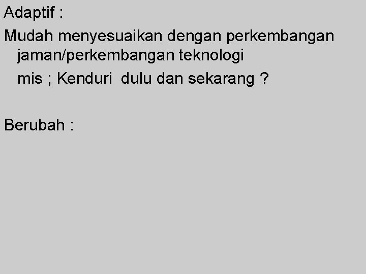 Adaptif : Mudah menyesuaikan dengan perkembangan jaman/perkembangan teknologi mis ; Kenduri dulu dan sekarang ? Berubah :