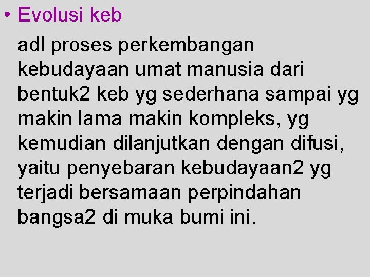 • Evolusi keb adl proses perkembangan kebudayaan umat manusia dari bentuk 2 keb yg sederhana sampai yg makin lama makin kompleks, yg kemudian dilanjutkan dengan difusi, yaitu penyebaran kebudayaan 2 yg terjadi bersamaan perpindahan bangsa 2 di muka bumi ini.