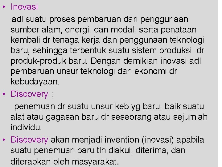 • Inovasi adl suatu proses pembaruan dari penggunaan sumber alam, energi, dan modal, serta penataan kembali dr tenaga kerja dan penggunaan teknologi baru, sehingga terbentuk suatu sistem produksi dr produk-produk baru. Dengan demikian inovasi adl pembaruan unsur teknologi dan ekonomi dr kebudayaan. • Discovery : penemuan dr suatu unsur keb yg baru, baik suatu alat atau gagasan baru dr seseorang atau sejumlah individu. • Discovery akan menjadi invention (inovasi) apabila suatu penemuan baru tlh diakui, diterima, dan diterapkan oleh masyarakat.