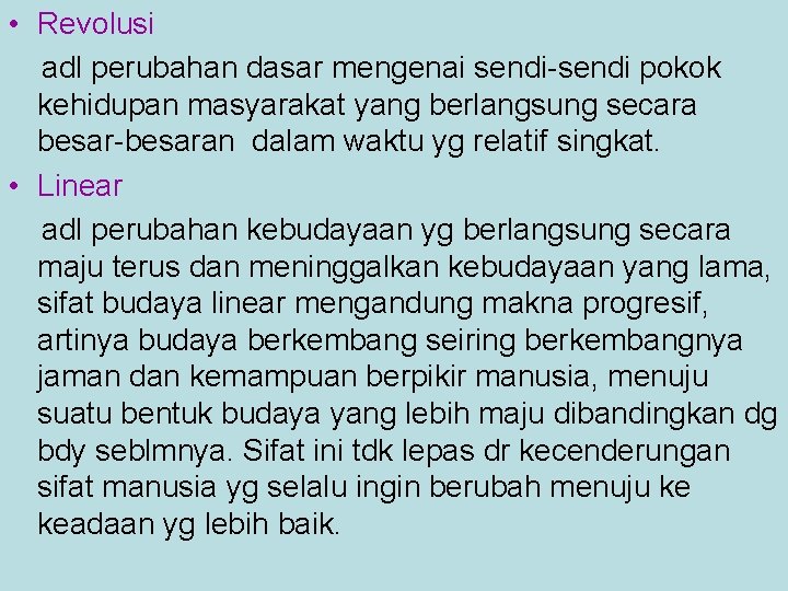 • Revolusi adl perubahan dasar mengenai sendi-sendi pokok kehidupan masyarakat yang berlangsung secara besar-besaran dalam waktu yg relatif singkat. • Linear adl perubahan kebudayaan yg berlangsung secara maju terus dan meninggalkan kebudayaan yang lama, sifat budaya linear mengandung makna progresif, artinya budaya berkembang seiring berkembangnya jaman dan kemampuan berpikir manusia, menuju suatu bentuk budaya yang lebih maju dibandingkan dg bdy seblmnya. Sifat ini tdk lepas dr kecenderungan sifat manusia yg selalu ingin berubah menuju ke keadaan yg lebih baik.