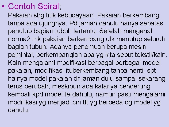 • Contoh Spiral; Pakaian sbg titik kebudayaan. Pakaian berkembang tanpa ada ujungnya. Pd jaman dahulu hanya sebatas penutup bagian tubuh tertentu. Setelah mengenal norma 2 mk pakaian berkembang utk menutup seluruh bagian tubuh. Adanya penemuan berupa mesin pemintal, berkembanglah apa yg kita sebut tekstil/kain. Kain mengalami modifikasi berbagai model pakaian, modifikasi ituberkembang tanpa henti, spt halnya model pakaian dr jaman dulu sampai sekarang terus berubah, meskipun ada kalanya cenderung kembali kpd model terdahulu, namun pasti mengalami modifikasi yg menjadi ciri ttt yg berbeda dg model yg dahulu.
