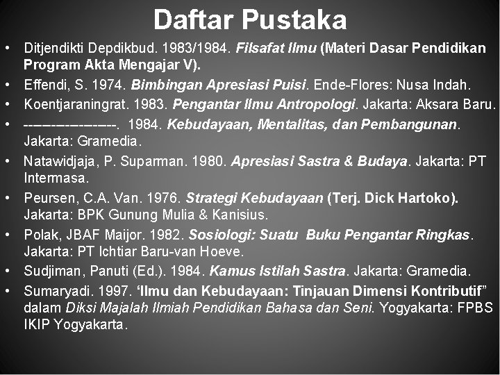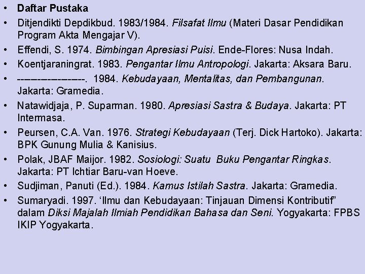 • Daftar Pustaka • Ditjendikti Depdikbud. 1983/1984. Filsafat Ilmu (Materi Dasar Pendidikan Program Akta Mengajar V). • Effendi, S. 1974. Bimbingan Apresiasi Puisi. Ende-Flores: Nusa Indah. • Koentjaraningrat. 1983. Pengantar Ilmu Antropologi. Jakarta: Aksara Baru. • ----------. 1984. Kebudayaan, Mentalitas, dan Pembangunan. Jakarta: Gramedia. • Natawidjaja, P. Suparman. 1980. Apresiasi Sastra & Budaya. Jakarta: PT Intermasa. • Peursen, C. A. Van. 1976. Strategi Kebudayaan (Terj. Dick Hartoko). Jakarta: BPK Gunung Mulia & Kanisius. • Polak, JBAF Maijor. 1982. Sosiologi: Suatu Buku Pengantar Ringkas. Jakarta: PT Ichtiar Baru-van Hoeve. • Sudjiman, Panuti (Ed. ). 1984. Kamus Istilah Sastra. Jakarta: Gramedia. • Sumaryadi. 1997. ‘Ilmu dan Kebudayaan: Tinjauan Dimensi Kontributif” dalam Diksi Majalah Ilmiah Pendidikan Bahasa dan Seni. Yogyakarta: FPBS IKIP Yogyakarta.