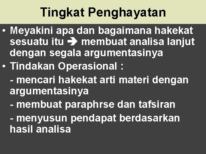 Tingkat Penghayatan • Meyakini apa dan bagaimana hakekat sesuatu itu membuat analisa lanjut dengan segala argumentasinya • Tindakan Operasional : - mencari hakekat arti materi dengan argumentasinya - membuat paraphrse dan tafsiran - menyusun pendapat berdasarkan hasil analisa