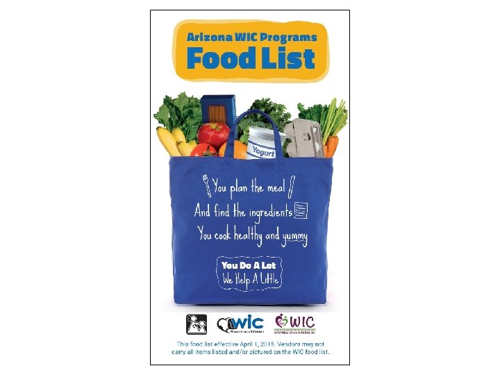 Potatoes • In 2009, the Institute of Medicine recommended that potatoes be excluded from the WIC food package since the WIC population already eats enough white potatoes, this opinion has not changed • New legislation recently passed (Consolidated and Further Continuing Appropriations Act) indicates no fruits or vegetables should be excluded from WIC – All state’s must allow all types of potatoes by July 1, 2015 – AZ will implement this on April 1, 2015 • We removed white potatoes from the can not buy side of the food list • Starting April 1, 2015 staff can tell participants that they can buy “any” vegetable • Nutritional Services Workgroup is going to come up with some talking points if participants have questions
