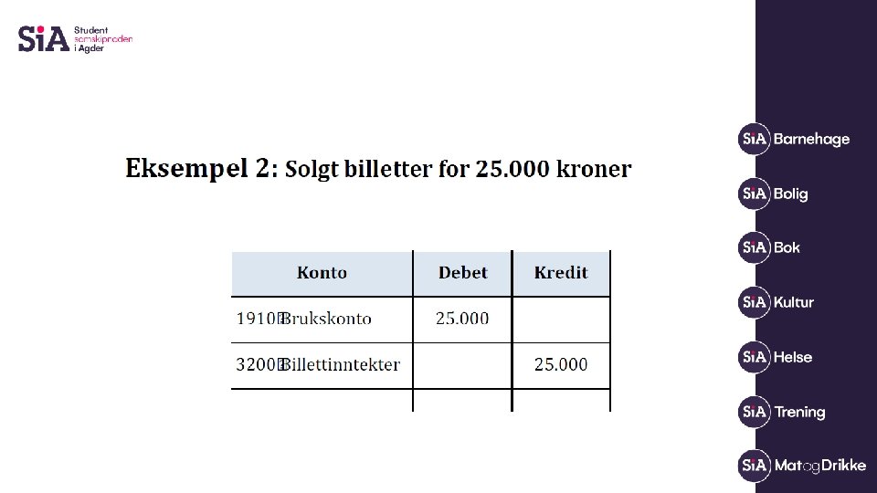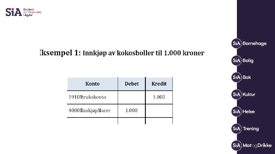 Oppgaver • Innbetaling bank kr 5. 000, - Driftstilskudd fra Si. A Vår 2021 Debet konto 1910 Bankkonto Kredit konto 3400 Støtte fra stud. sos. Midler • Innbetaling bank kr 250, - Medlemsavgift vår 2021 John Johansen Debet konto 1910 Bankkonto Kredit konto 3100 Medlemskontingent • Faktura 54897 fra Komplett AS kr 4990, - Lenovo Thinkpad Debet konto 6551 Datautstyr Kredit konto 2400 Leverandørgjeld • Bankbilag – betaling av faktura 54897 fra Komplett AS kr 4990, Debet konto 2400 Leverandørgjeld Kredit konto 1910 Bank