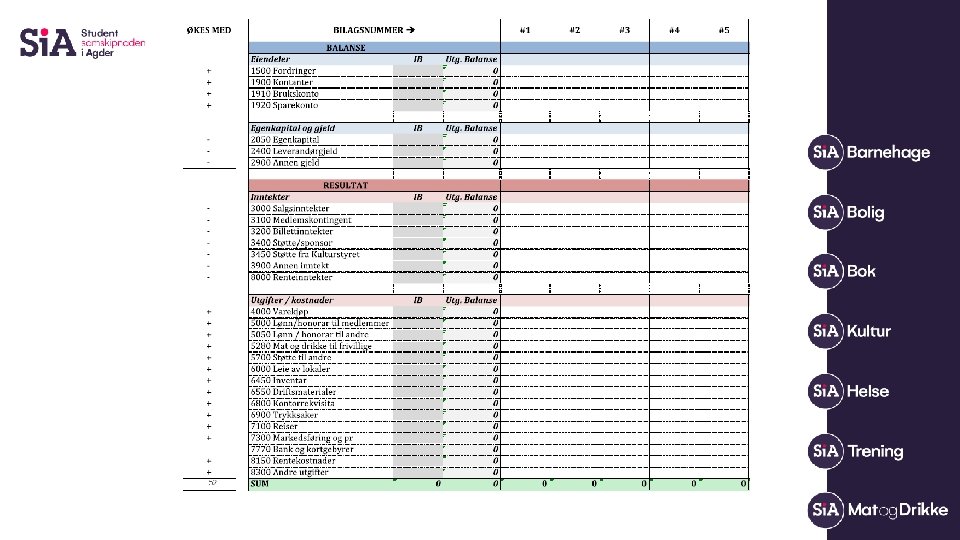 Resultat regnskapet Inntekter • Salgsinntekter • Studentsosiale midler Kostnader • Innkjøp av varer • Kontorrekvisita • Bankgebyrer
