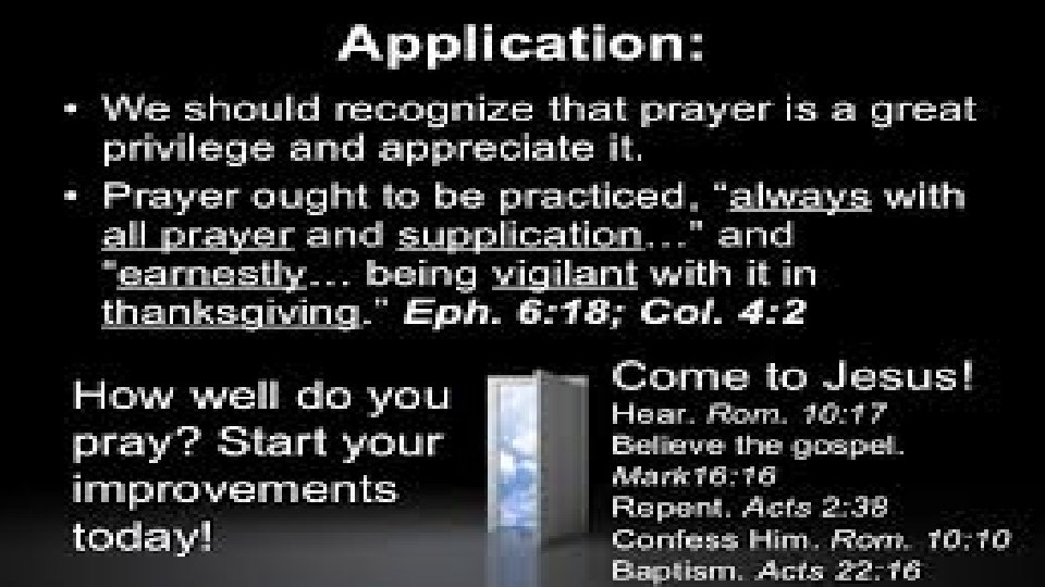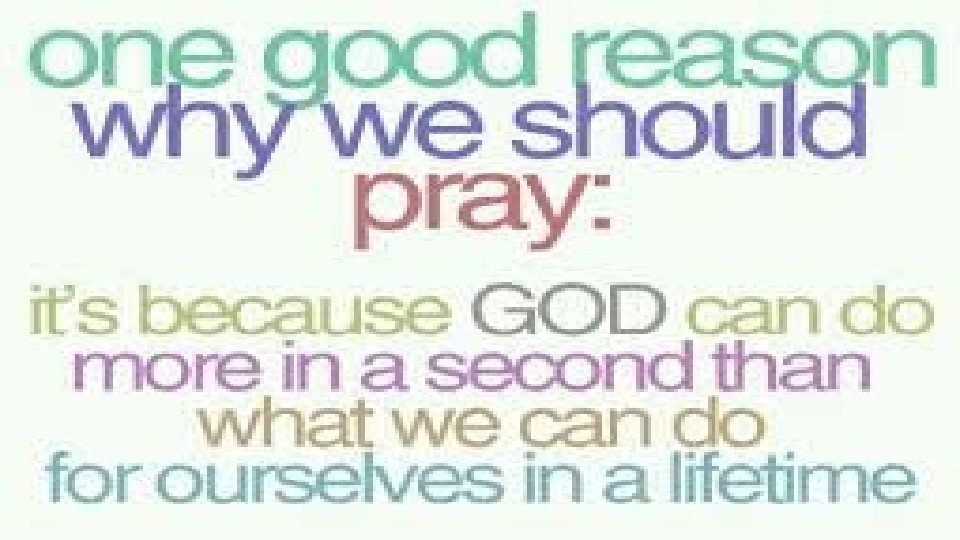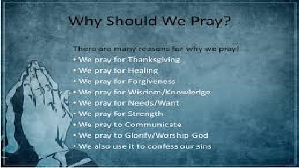 3) Prayer for the Nation (5: 17 -18). Elijah is mentioned and the text in the old Testament is I Kings 17 -18 for further reading. The point of these verses is that prayer is Powerful. “The prayer of a righteous man is powerful and effective” (5: 16). • 4) Prayer for the straying (5: 19 -20) These verses deal with our ministry to a fellow believer who strays, (to wander) from the truth and gets into sin. • Prayer, it’s something we do, but exactly why should we talk to God? These verses tell us why. Restoration (v. 15), Forgiveness (v. 15), Healing (v. 16), Our nations problems (vs. 17 -18), Salvation of a soul (v. 20), Covering of sins (v. 20). Why should we talk to God in all these situations? Really! Why do you pray?