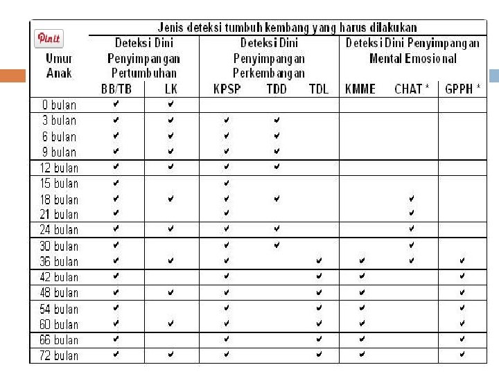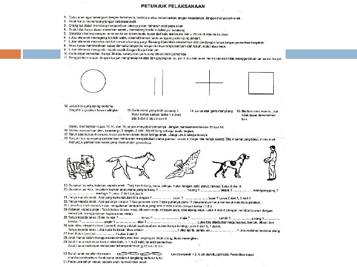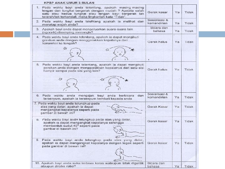 Kuesioner Pra Skrining Perkembangan (KPSP) § § 9 -10 pertanyaan singkat pada orang-tua / pengasuh, tentang kemampuan yang telah dicapai oleh anak mulai umur 3 bulan, minimal tiap 3 bulan sampai umur 2 tahun, minimal tiap 6 bulan sampai umur 6 tahun untuk mengetahui perkembangan anak sesuai umurnya atau terlambat Alat : 1. Kuesioner (daftar pertanyaan) sesuai umur anak 2. Kertas, pensil, 3. bola karet atau plastik seukuran bola tenis, 4. kerincingan, 5. kubus berukuran sisi 2, 5 cm sebanyak 6 buah, 6. benda-benda kecil seperti kismis/potongan biskuit kecil berukuran 0, 5 -1 cm