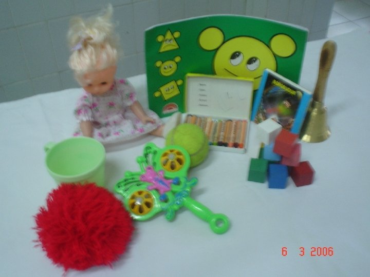 Alat-alat Bahan : benang wool warna merah, kismis, krincingan, kubus kayu berwarna dgn luas 2, 5 cm, botol kaca kecil bening dgn lubang 2, 5 cm, bel kecil, bola tenis, pensil merah, boneka kecil dgn botol susu, cangkir plastik dgn pegangan, kertas kosong Semua materi ditempatkan dalam satu kotak, selain itu diperlukan meja dan kursi, ruangan yang cukup luas dan untuk bayi gunakan matras