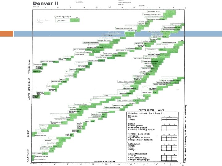 Formulir Denver II Deteksi dini penyimpangan perkembangan anak umur kurang dari 6 tahun, berisi 125 gugus tugas yang disusun dalam formulir menjadi 4 sektor untuk menjaring fungsi tersebut Skala umur tertera pada bagian atas formulir yang trebagi dari umur dalam bulan dan tahun sejak lahir sampai berusia 6 tahun Setiap ruang antara tanda umur mewakili 1 bulan, sampai anak berusia 21 bulan, kemudian mewakili 3 bulan sampai anak berusia 6 tahun