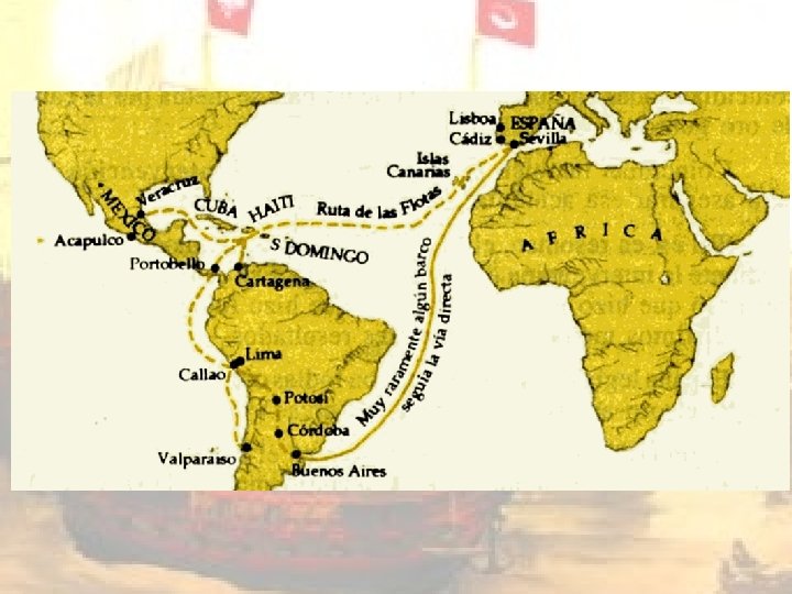 • Para ello se implementó el sistema de flota y galeones, que consistía en la circulación de navíos mercantes desde Europa hacia América y viceversa. Estos, además, eran vigilados de cerca por barcos de guerra (galeones), los que aseguraban la integridad de las mercancías y de la tripulación.