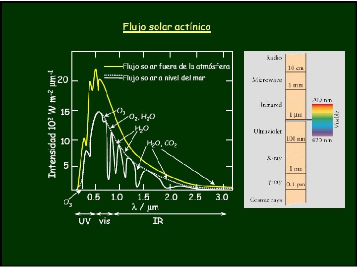 Photochemical reactions in the Atmosphere 1. Available light j AB + h A + B 2. Absorptions spectrum h = hc/ j light frequency light wavelength photolysis rate Examples: Strong bond O-O (O 2) 119 Kcal/mol; = 240 nm Weak bond O-O 2 (O 3) NIR, Vis, UV 25 Kcal/mol; =1122 nm 3. Quantum yield