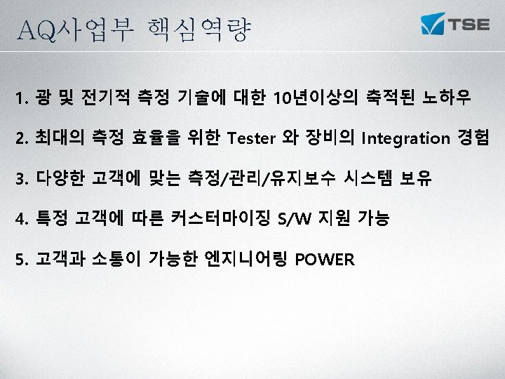 AQ사업부 핵심기술 1. LED / LD 광 및 전기적 측정 2. Semi-Conductor / LED / RF Chip 측정에 필요한 Prober / Handler 장비 구현 3. AMOLED 용 Pattern Generator / Array Tester 구현 4. 반도체 장비의 Hot Test 가능한 Chamber 및 Hot Plate 구현 5. Sorter / Prober / Handler / Taping / Dispensing 등의 다양한 Pick & Place 기술
