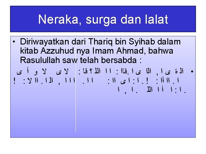 ﻻ ﻳﺍ ﻳﺍ ﺍ ﺍ ﻳﺍ ﺍ ﻳﺍ ﻯ ﺍﺍ ﺍ ﻭ • ﻻ “Tidak akan bergeser dua telapak kaki • seorang hamba pada hari kiamat sampai dia ditanya (dimintai pertanggungjawaban) tentang umurnya kemana dihabiskannya, tentang ilmunya bagaimana dia mengamalkannya, tentang hartanya; dari mana diperolehnya dan ke mana dibelanjakannya, serta tentang tubuhnya untuk apa digunakannya “. [HR at-Tirmidzi no. 2417)