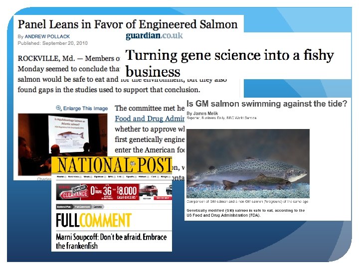 Literature Review Ethical and Social Concerns: Dawkins, Rollin Policy of Risk and Regulation: Hoberg, Harrison Existing reviews of risk associated with transgenic salmon: Factors to consider before production and commercialization of aquatic genetically modified organisms: the case of transgenic salmon: Le Curieux-Belfond, Olivier; Vandelac, Louise; Caron, Joseph; Séralini, GillesÉric. Source: Environ. Sci. & Policy, 2009, 12, 2, 170 -189 Democratic concerns and public perception: newspaper articles, Atwood FDA meeting material : http: //www. fda. gov/Advisory. Committees/Committees. Meeting. Materi als/Veterinary. Medicine. Advisory. Committee/ucm 201810. htm