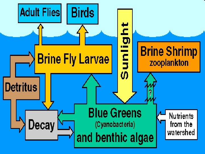 Detritus • The poop and bodies of decaying organisms (detritus) fall like snow to the benthos (bottom) by gravity. • Benthic bacteria convert the detritus into nitrates that algae use as nutrients for photosynthesis. • Currents bring these nutrients to the surface where photosynthesis can take place (eutrophication)