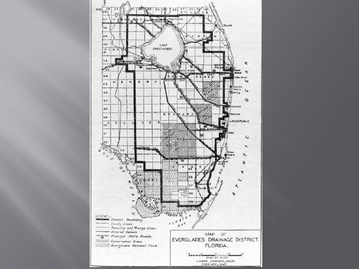 1905 - FL governor Napoleon Bonaparte Broward began the push to drain the Everglades Miami and Ft. Lauderdale were created when tracts of land were drained into farmland 1948 - Central and South Florida Project (US congress)-- created man-made canals and levees moving over 1 billion gallons of water daily into the ocean The Everglades is now one half of the size it used to be due to this change