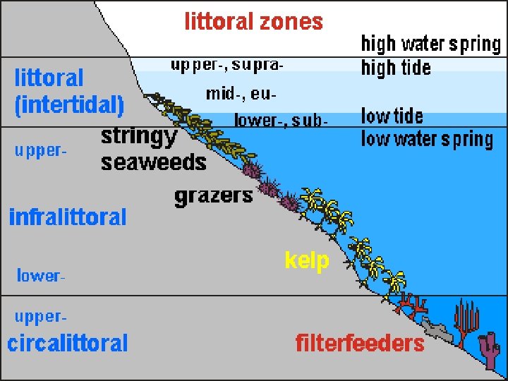 Intertidal Zone rocky coasts stratified vertically Where only highest tides reach l a few species of algae and mollusks l submerged during high tide l more diverse array of algae and small animals, such as herbivorous snails, crabs, sea stars, and small fishes bottom of the intertidal zone l only exposed during the lowest tides, many invertebrates, fishes, and seaweed can be found