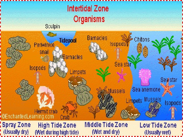 Intertidal Zone where the ocean meets the land sometimes submerged and at other times exposed waves and tides come in and out communities are constantly changing