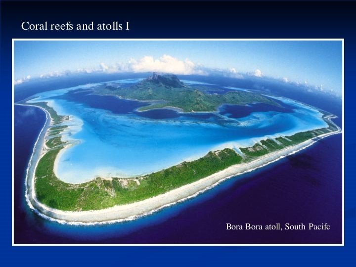 Types of Coral Reefs Atolls Ring-shaped islands of coral in open sea Form on submerged mud banks or volcano craters Surround a seawater lagoon Channels connect lagoon to the sea