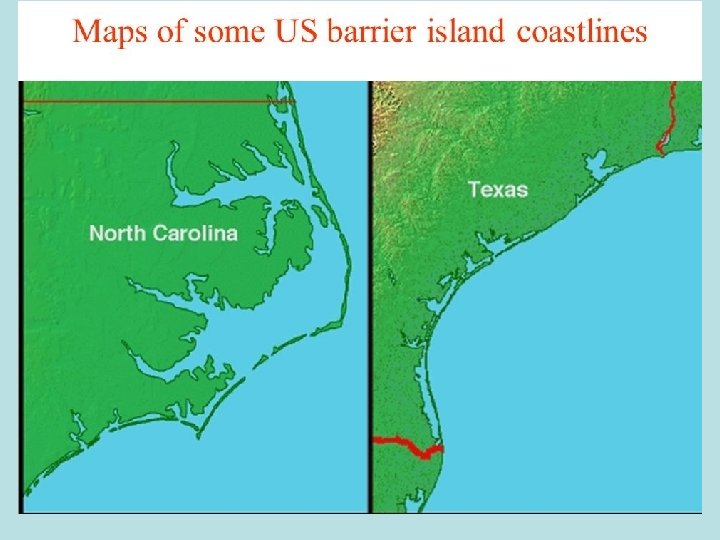Barrier Islands – ex. South Padre • Low, narrow, offshore sandy islands • Dunes protect land from sea wave erosion during tide changes.